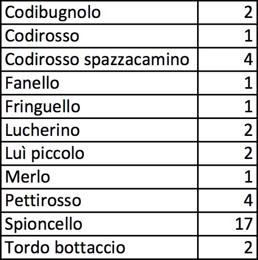 Le specie catturate sono 16, con ancora segnali di migratori “lunghi” come il prispolone, il beccafico e il culbianco.